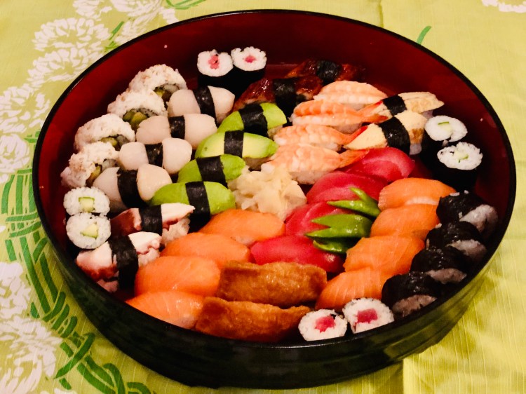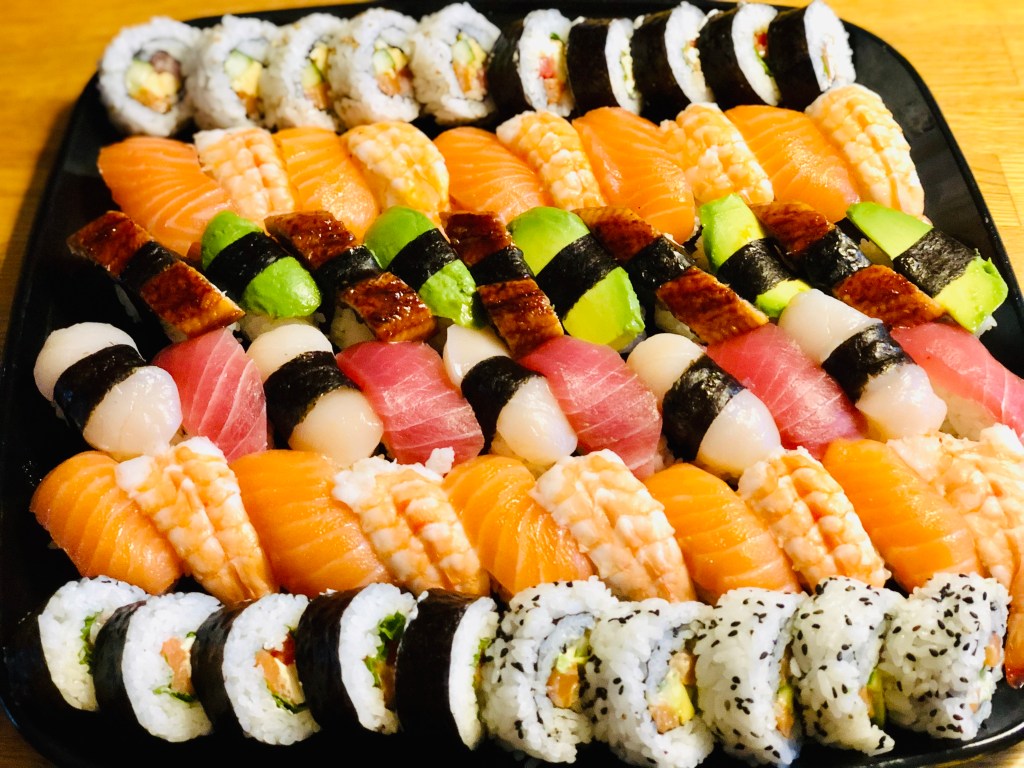 Lax, Räkor, Tonfisk, Pilgrimsmussla, Unagi (ål), Hamachi (yellow tail)